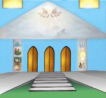 The Portico roof depicts Mashiach coming to earth in all of His glory and the peoples of the world reaching up to Him. The two pillars—the strength of Israel and the establishment of the Body of Believers throughout the world— both support the reign of Mashiach on the earth. Just above the portico roof are three large windows, about 25 ft. tall each. These windows represent the manifest glory of ADONAI. In the center is Abba, the Creator, sitting above an expanse of blue and being transported by living creatures with four faces and four wings. To the right is Mashiach, cloaked in a cloud tallit, with tzit-zit streaming from the cloud. To the left is a depiction of the Ruach HaKodesh (Holy Spirit) as the Ruach appeared to the children of Israel in the desert as a pillar of fire and cloud. From the Most Holy Place (the place of the presence of G-d) and in the Community Confession, Mashiach is seen at the right hand of the Father.